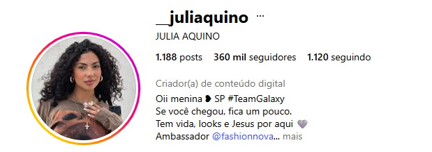 Julia Aquino produz conteúdos de moda, rotina e lifestyle urbano. Seu feed leve e contemporâneo reforça sua identidade e atrai um público conectado com tendências e vida real.