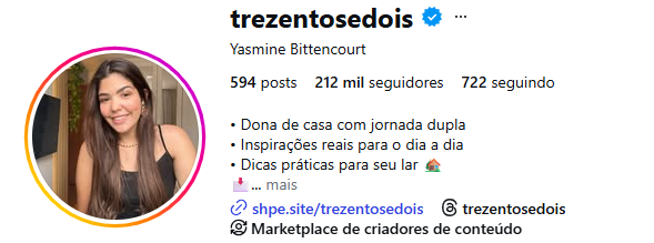 Yasmine Bittencourt é influenciadora digital especializada em casa, decoração e lifestyle, com foco em design de interiores e ambientes aconchegantes. Seu perfil @trezentosedois apresenta conteúdo voltado a ideias de decoração, projetos residenciais e inspiração para quem ama transformar espaços.